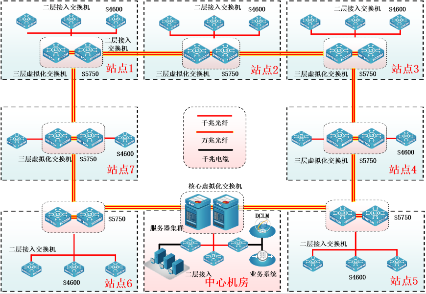 高可靠性:双环网,每节点双设备虚拟化冗余,骨干不存在单点故障;