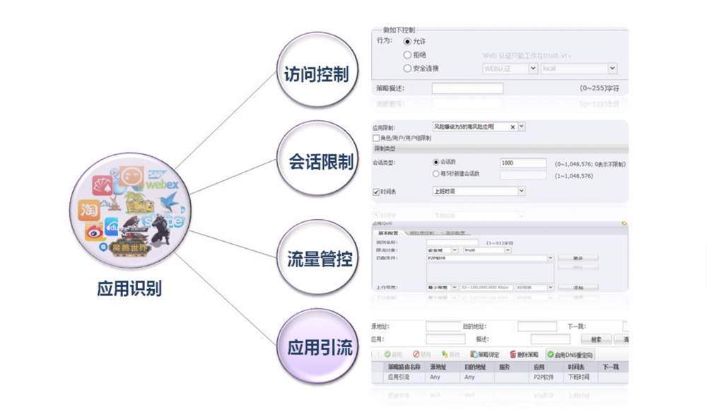 ●灵活应用控制。基于深度应用识别及精细化的应用筛选,凯发K8数码下一代防火墙支持灵活的安全控制功能。包括策略阻止、会话限制、流量管控、应用引流或时间限制等。