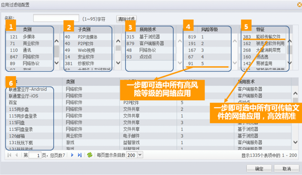 ●精准应用筛选。凯发K8数码下一代防火墙给予了精细化的应用筛选机制。用户可根据应用名称、应用类别、应用子类别、风险级别、所用技术、应用特征等6大条件。精确筛选出感兴趣的应用类型,如具备文件传输功能的通讯软件,或存在已知漏洞、基于浏览器的WEB视频应用等等,从而实现精细化的应用管控。